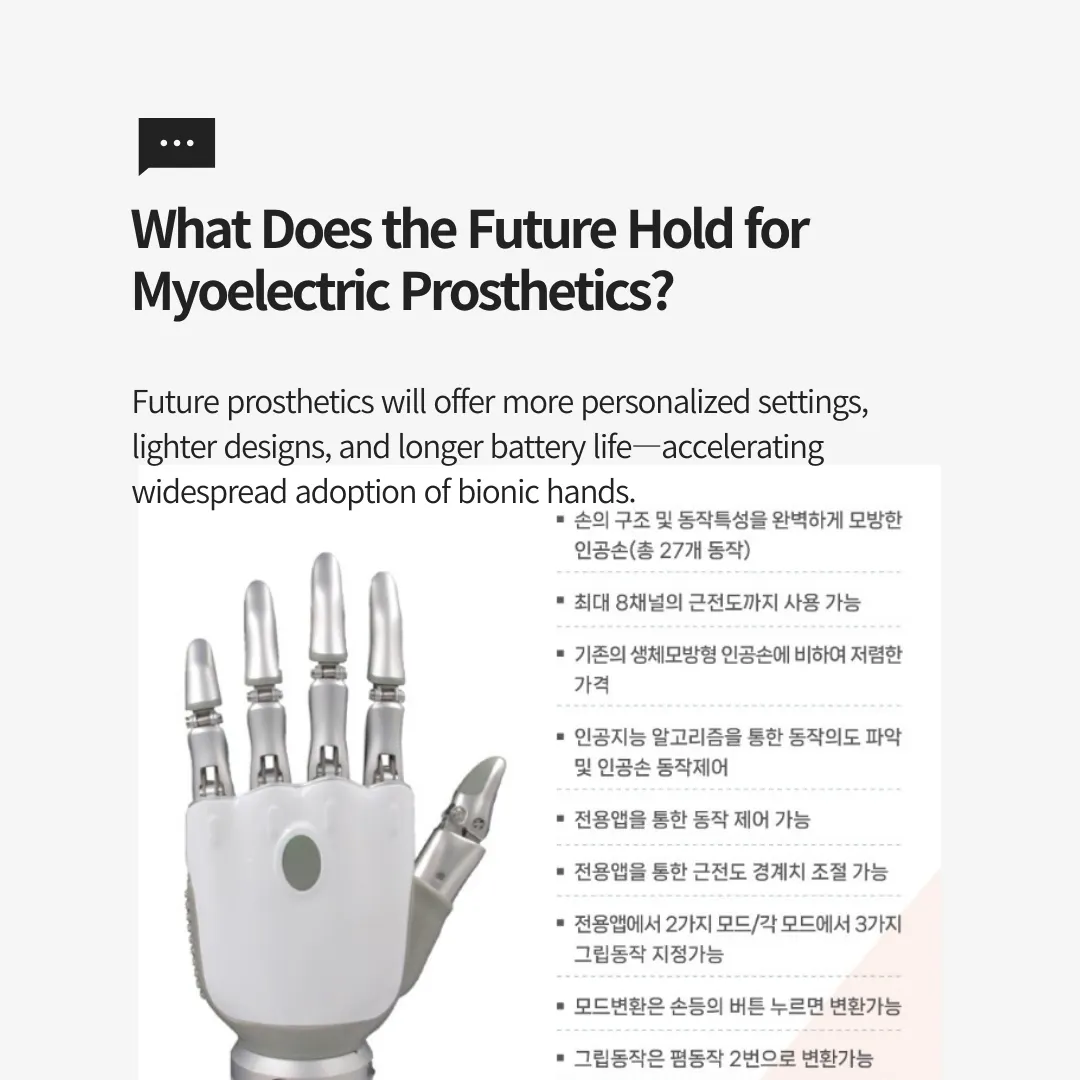 Myoelectric prosthetics are expected to become more sophisticated and widely accessible as AI, sensor technology, and battery performance continue to advance.