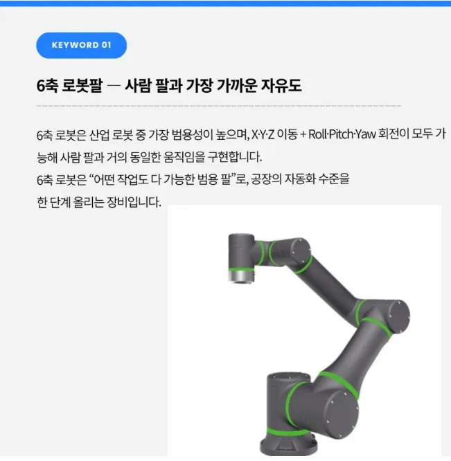 6축 로봇은 “어떤 작업도 다 가능한 범용 팔”로, 공장의 자동화 수준을 한 단계 올리는 장비입니다.